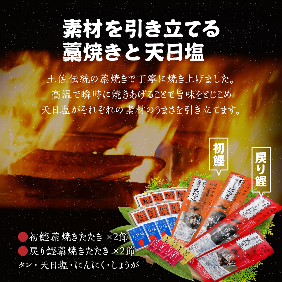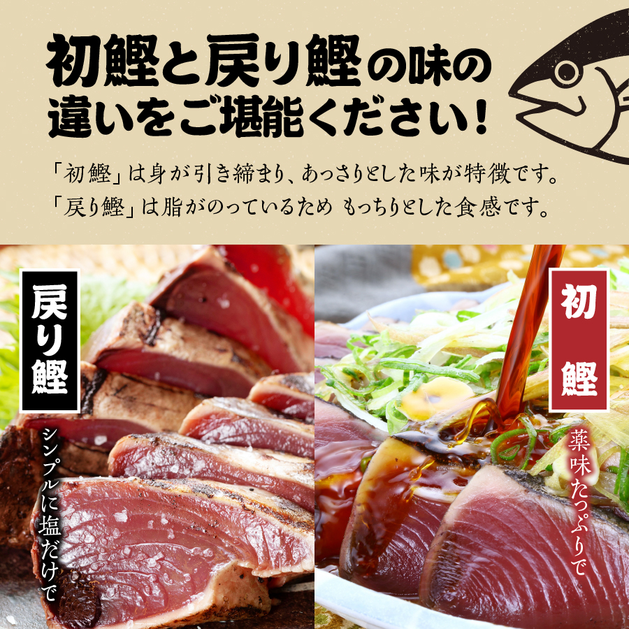 ■セット内容:初鰹藁焼きたたき×2節(合計約700g)、戻り鰹藁焼きたたき×2節(合計約540g)、20mlタレ×8袋、天日塩5g×4袋、にんにく・しょうが×各4袋◯賞味期限:冷凍で30日間◎合計で約12人前(1節約2~3人前)