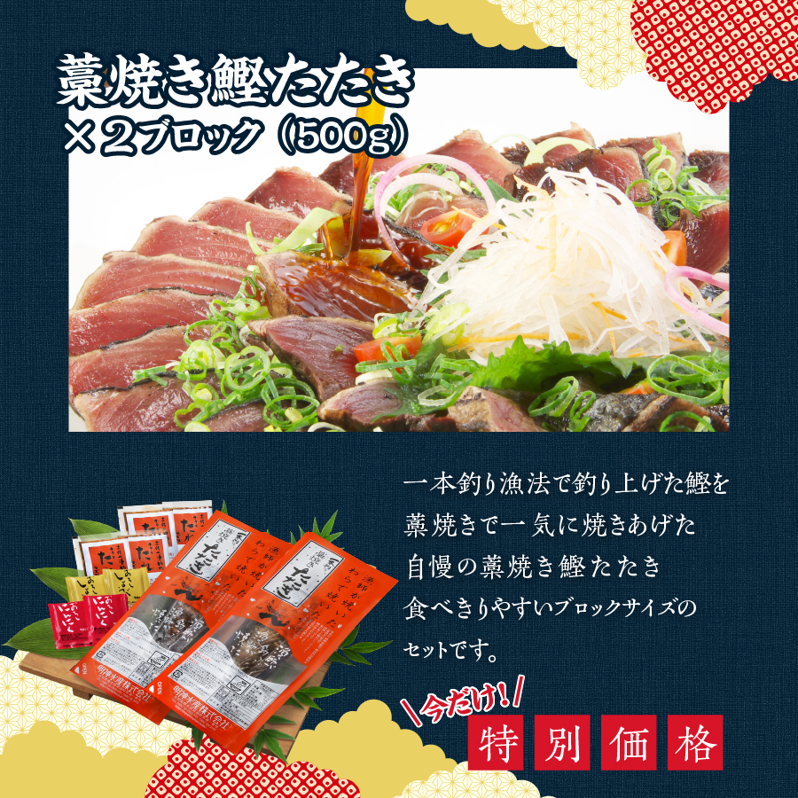 ■セット内容:藁焼き鰹たたき超特大ブロック×2袋(合計約500g)、20mlタレ×4袋、ニンニク・しょうが×各2袋○賞味期限:冷凍で30日間◎合計で約4人前(1袋約2人前)