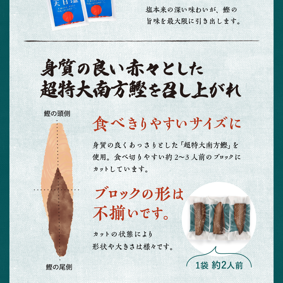 ■セット内容:鰹たたき超特大(ブロック)×5~8袋(合計約1.5kg)、天日塩5g×6袋、40mlタレ×6袋、にんにく・しょうが×各6袋○賞味期限:冷凍で30日間◎合計で約12人前(1袋約2人前)