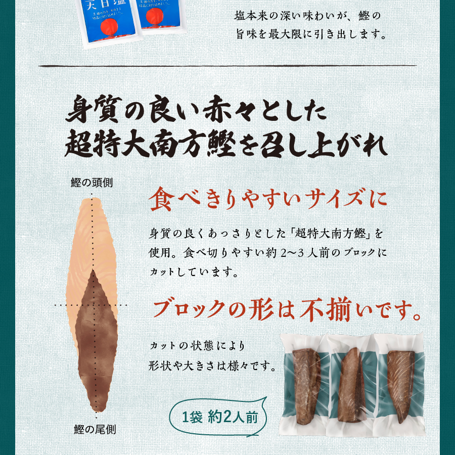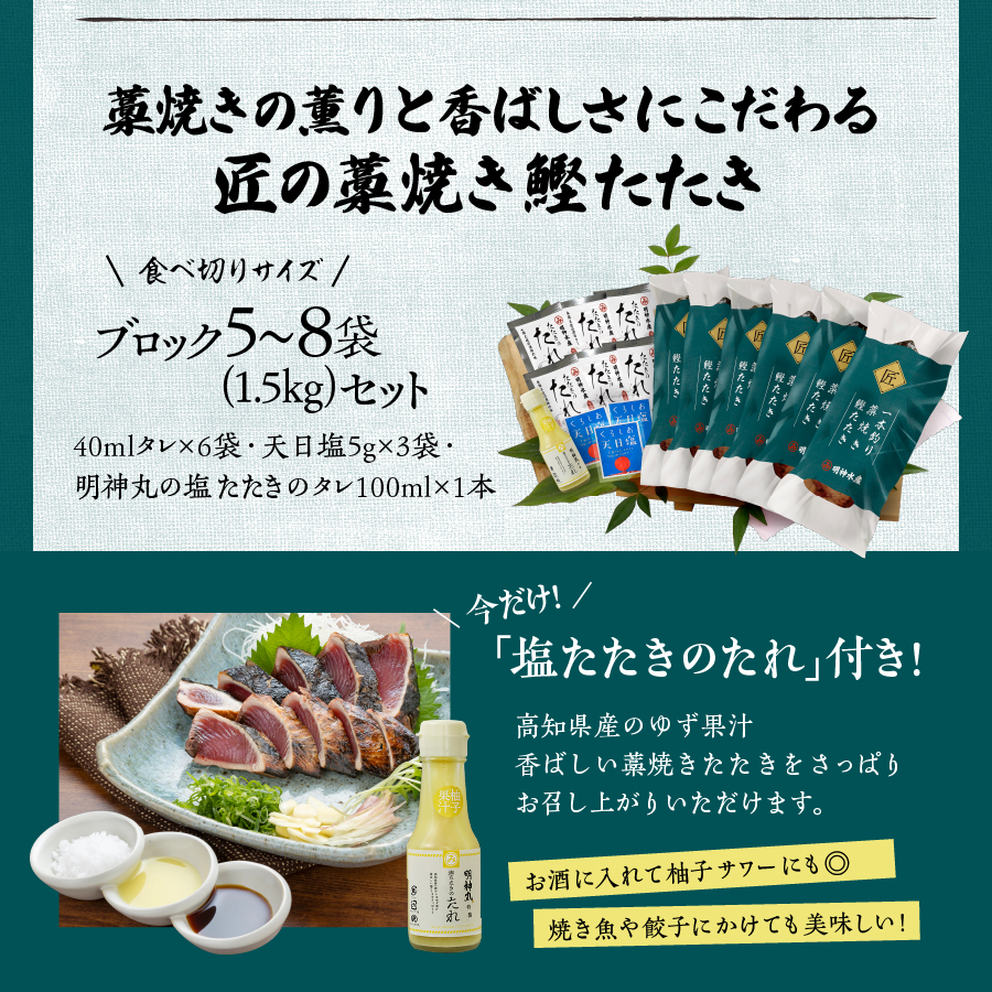 ■セット内容:鰹たたき超特大(ブロック)× 5~8袋(合計約1.5kg)、40mlタレ×6袋、天日塩5gx3袋、明神丸の塩たたきのタレ100ml×1本○賞味期限:冷凍で30日間◎合計で約12人前(1袋約2人前)