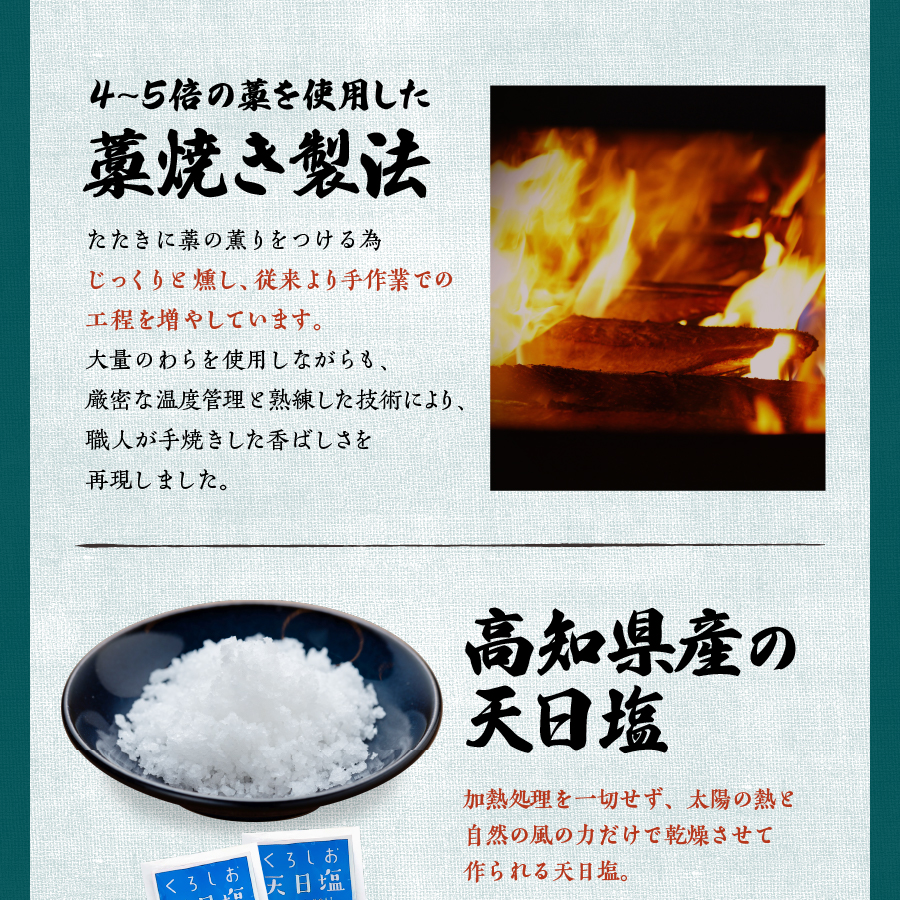 乾燥させて作った天日塩は深い味わいをもち、鰹の味を最大限に引き出します。