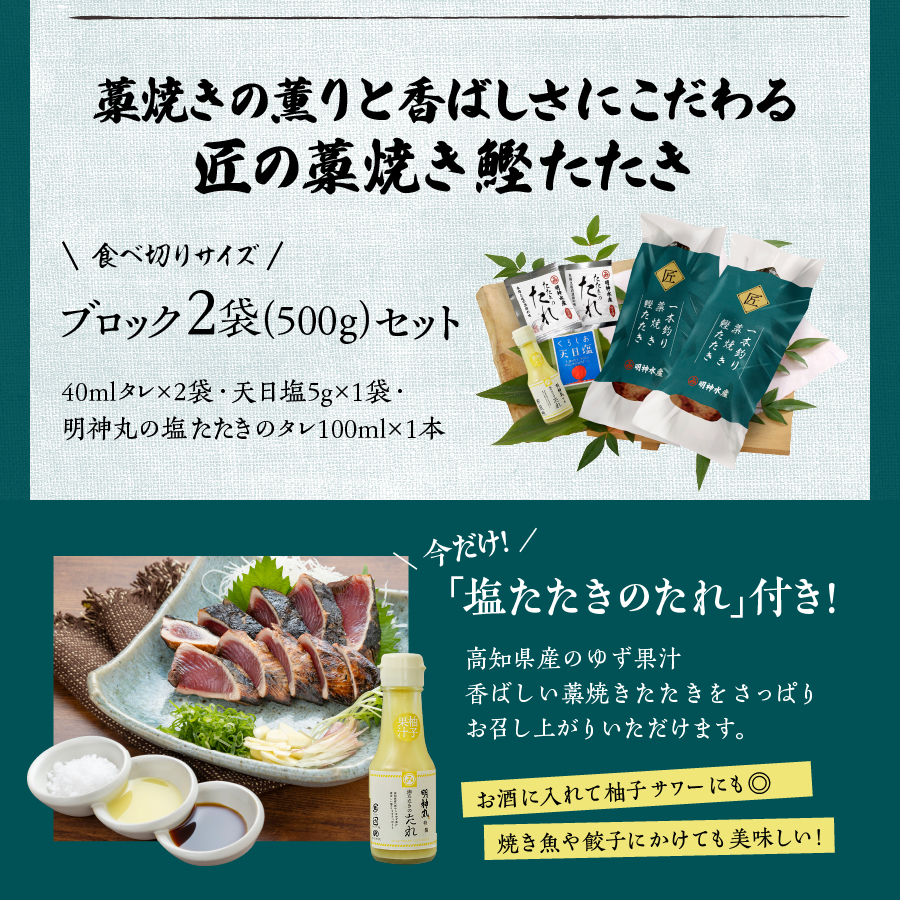■セット内容:鰹たたき超特大(ブロック)×2袋(合計約500g)、40mlタレ×2袋、天日塩5g×1袋、明神丸の塩たたきのタレ100ml×1本○賞味期限:冷凍で30日間◎合計で約4人前(1袋約2人前)